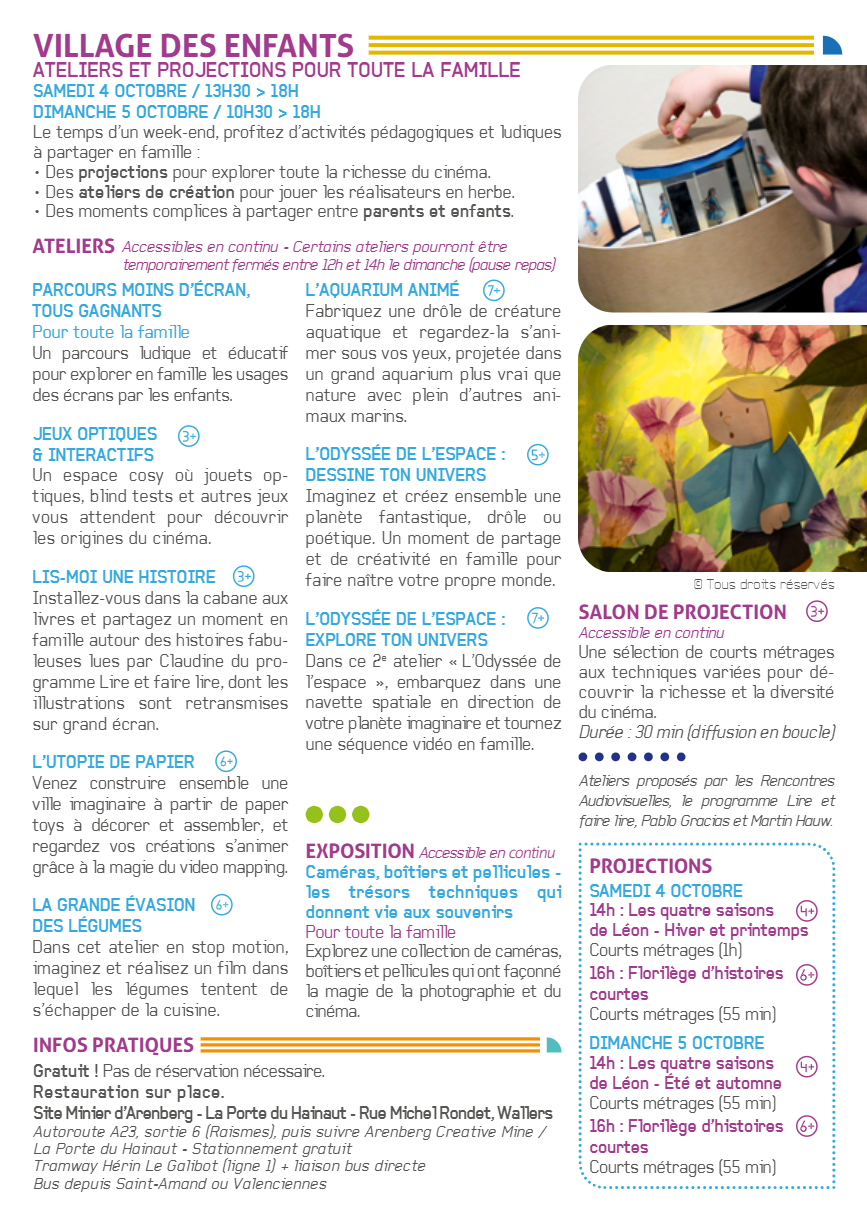 Le Village des Enfants est de retour au Site minier d’Arenberg – La Porte du Hainaut les 04 et 05 octobre 2025 ! En partenariat avec les Rencontres Audiovisuelles, découvrez l’univers du court métrage à travers des ateliers créatifs, des projections, et des activités à partager en famille.